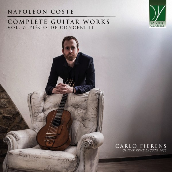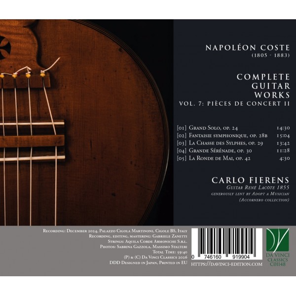 Le Volume VII des Œuvres complètes pour guitare de Napoléon Coste, Pièces de concert II, réunit certaines de ses pages les plus ambitieuses, façonnées dans le climat parisien où la guitare revendiquait une dignité égale aux grandes formes musicales. Au centre du programme figurent les œuvres liées au concours Makaroff de 1856 : de la vaste et changeante Fantaisie symphonique op. 28b à la Grande Sérénade op. 30, où geste théâtral et construction thématique se poursuivent et se répondent. La Chasse des Sylphes op. 29 transforme l'imaginaire romantique en véritable récit instrumental, tandis que La Ronde de Mai op. 42 conclut par un divertissement qui conserve l'élégance du salon sans renoncer à une réelle densité harmonique.