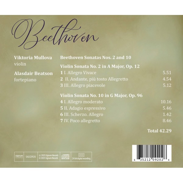 Pour leur troisième album en duo chez Signum Classics, Viktoria Mullova et Alasdair Beatson interprètent les Sonates n°2 et n°10 de Beethoven. Ce qui rend cet enregistrement unique, c'est le choix des instruments : pour la Sonate en la majeur, op. 12 n°2, ils utilisent une copie d'un pianoforte viennois Walter de 1805, et pour la Sonate n°10, op. 96, une copie d'un Graf de 1819 — toutes deux réalisées par le facteur Paul McNulty.