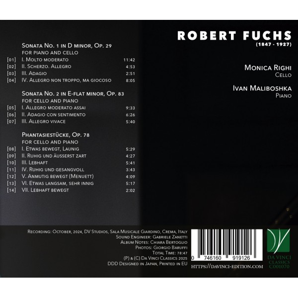 Cet album met en lumière les œuvres pour violoncelle de Robert Fuchs, maître viennois redécouvert aujourd'hui. Professeur admiré de Mahler, Wolf ou Sibelius, Fuchs fut aussi un compositeur raffiné, alliant lyrisme et clarté formelle. De l'élan juvénile de la Première Sonate aux couleurs élégantes des Phantasiestücke puis à la maturité chaleureuse de la Deuxième Sonate, le violoncelle y chante avec intensité, soutenu par un piano virtuose. Une plongée rare et envoûtante dans le romantisme viennois.