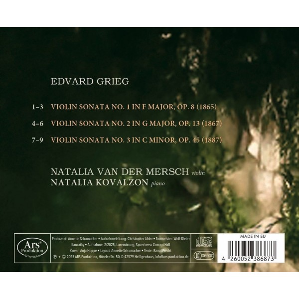 La violoniste Natalia van der Mersch et la pianiste Natalia Kovalzon interprètent les trois sonates pour violon et piano d'Edvard Grieg. Leur jeu, à la fois brillant, dynamique et profondément ancré dans la tradition interprétative, met en lumière les singularités et la force de ces œuvres, chacune se distinguant par son langage et son expressivité uniques.
