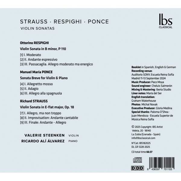 De la fougue mélodique de la Sonate en mi bémol majeur de Strauss à l'architecture monumentale de la Sonate en si mineur de Respighi, jusqu'à l'élégance néoclassique et la poésie mexicaine de la Sonata breve de Ponce, cet enregistrement met en lumière la richesse et la diversité du répertoire. Concertmaster de l'Orchestre national d'Espagne, Valerie Steenken déploie un son lumineux et une grande finesse d'expression, en parfaite symbiose avec le jeu sensible et sculpté de Ricardo Alí Álvarez, professeur à l'École Reine Sofía. Par la cohérence et la profondeur de leur dialogue musical, les deux interprètes donnent vie à ces œuvres avec une rare intensité, confirmant l'engagement d'IBS Classical en faveur de l'excellence artistique et du renouveau du grand répertoire de musique de chambre.