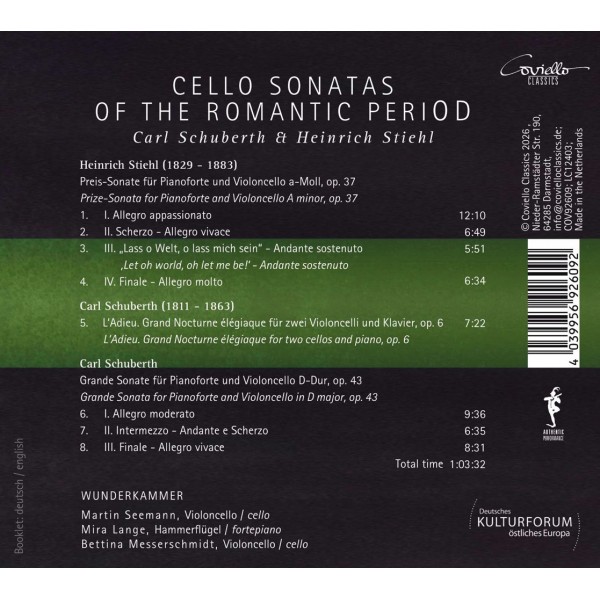 Leurs œuvres illustrent un « second rang » musical qui a façonné la vie musicale du XIXᵉ siècle, dont la qualité ne peut être pleinement redécouverte qu'aujourd'hui. L'accent est mis sur la Sonate pour piano et violoncelle en la mineur, op. 37, de Heinrich Stiehl. Carl Schuberth est représenté par deux œuvres qui témoignent de son inventivité mélodique et de son approche virtuose du violoncelle : le Grand Nocturne élégiaque, op. 6, pour deux violoncelles et piano, et la Grande Sonate pour violoncelle et piano en ré majeur, op. 43, œuvre tardive combinant sonorité orchestrale et gestes de type ballade. Cette musique est interprétée par Martin Seemann et Bettina Messerschmidt (violoncelle) et Mira Lange au fortepiano historique Streicher & Söhne (Vienne 1864). La pratique de la performance historiquement informée confère aux œuvres une sonorité transparente et colorée, permettant de vivre pleinement leur expression romantique dans toute sa complexité.